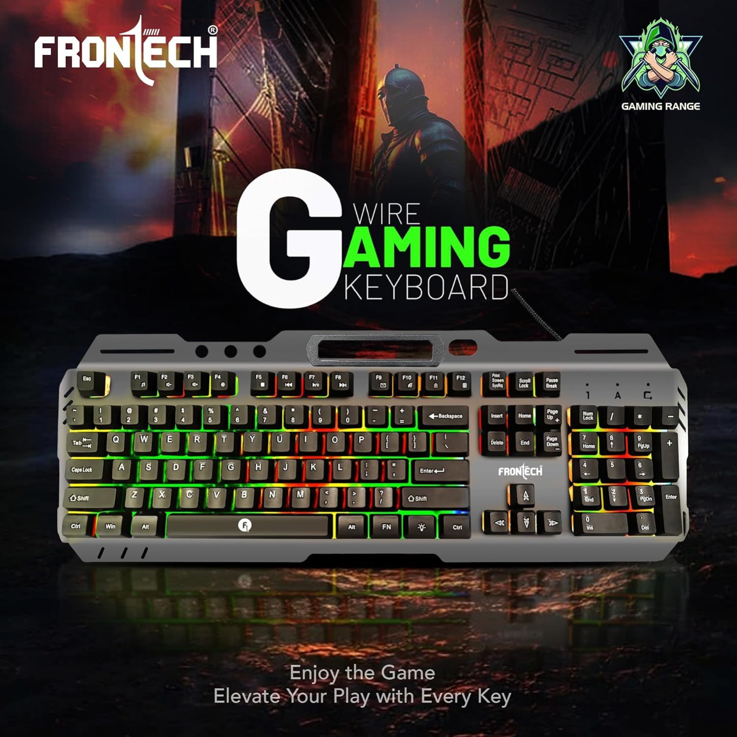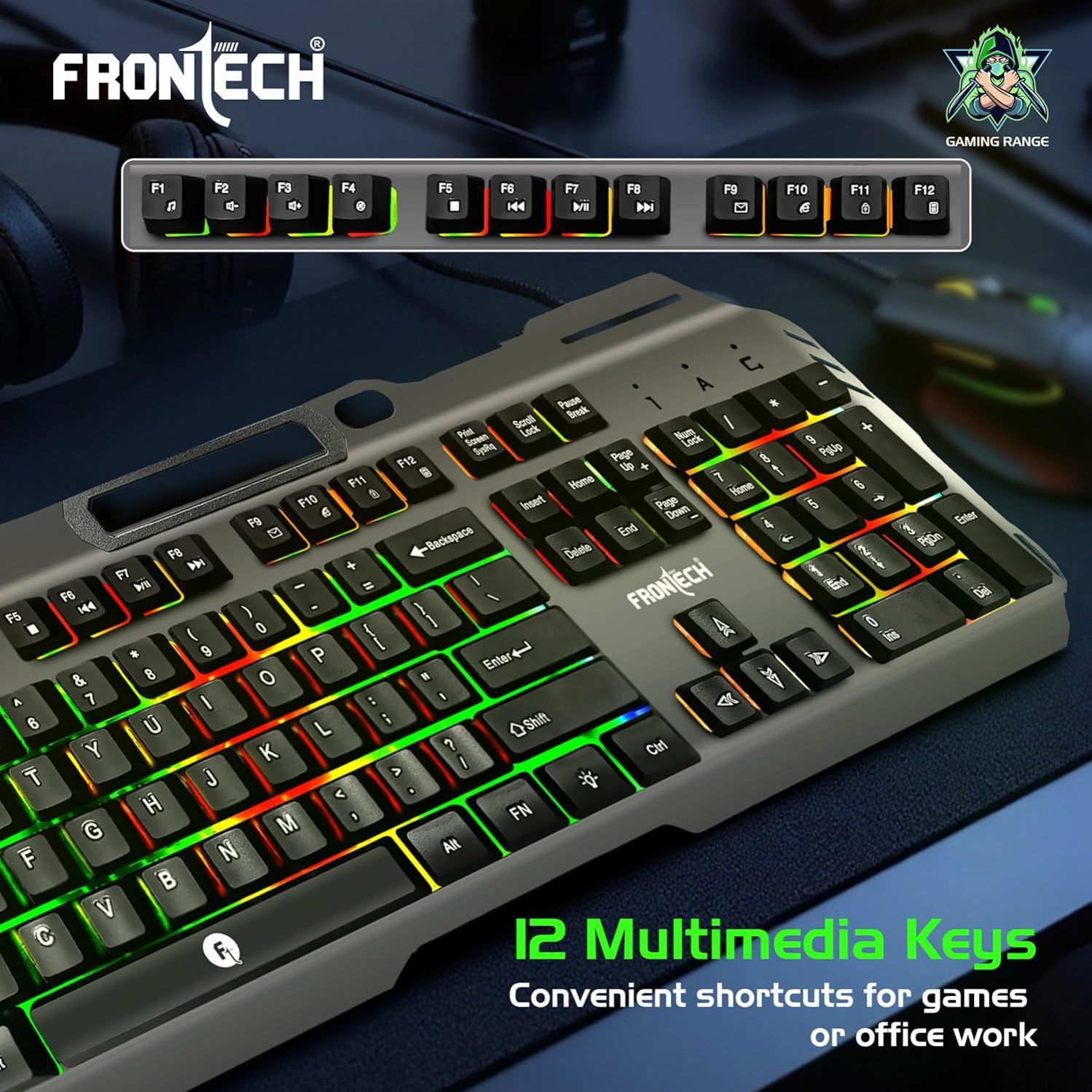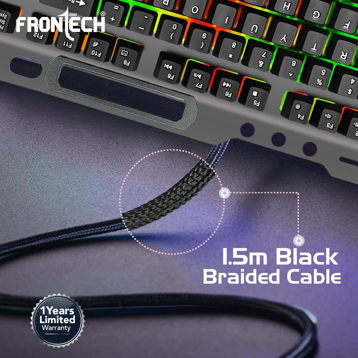 FRONTECH Wired Gaming Keyboard with 104 Keys | Rainbow Backlight Effect | Membrane Keys with 1.5M Braided Cable | USB Plug & Play | Ergonomic Design (KB-0049, Grey & Black