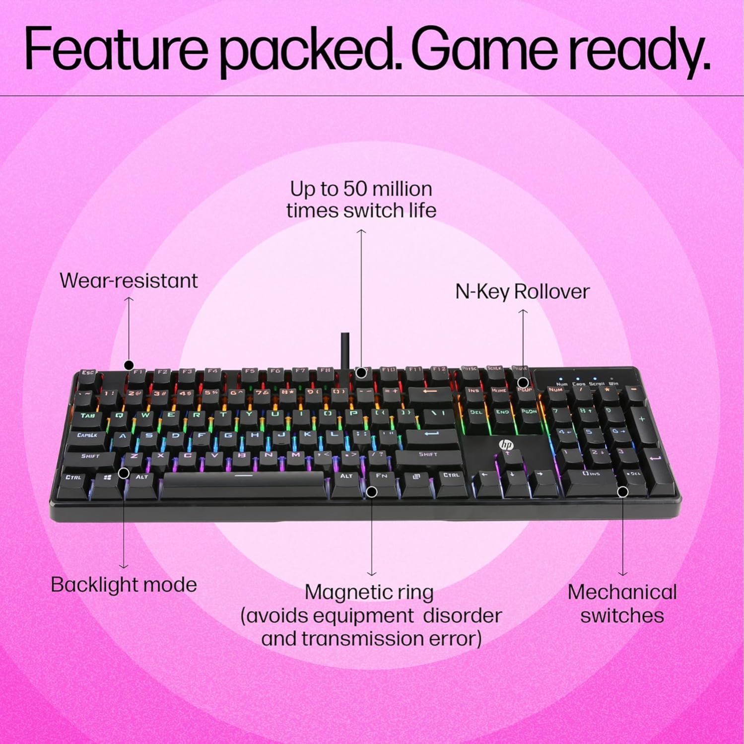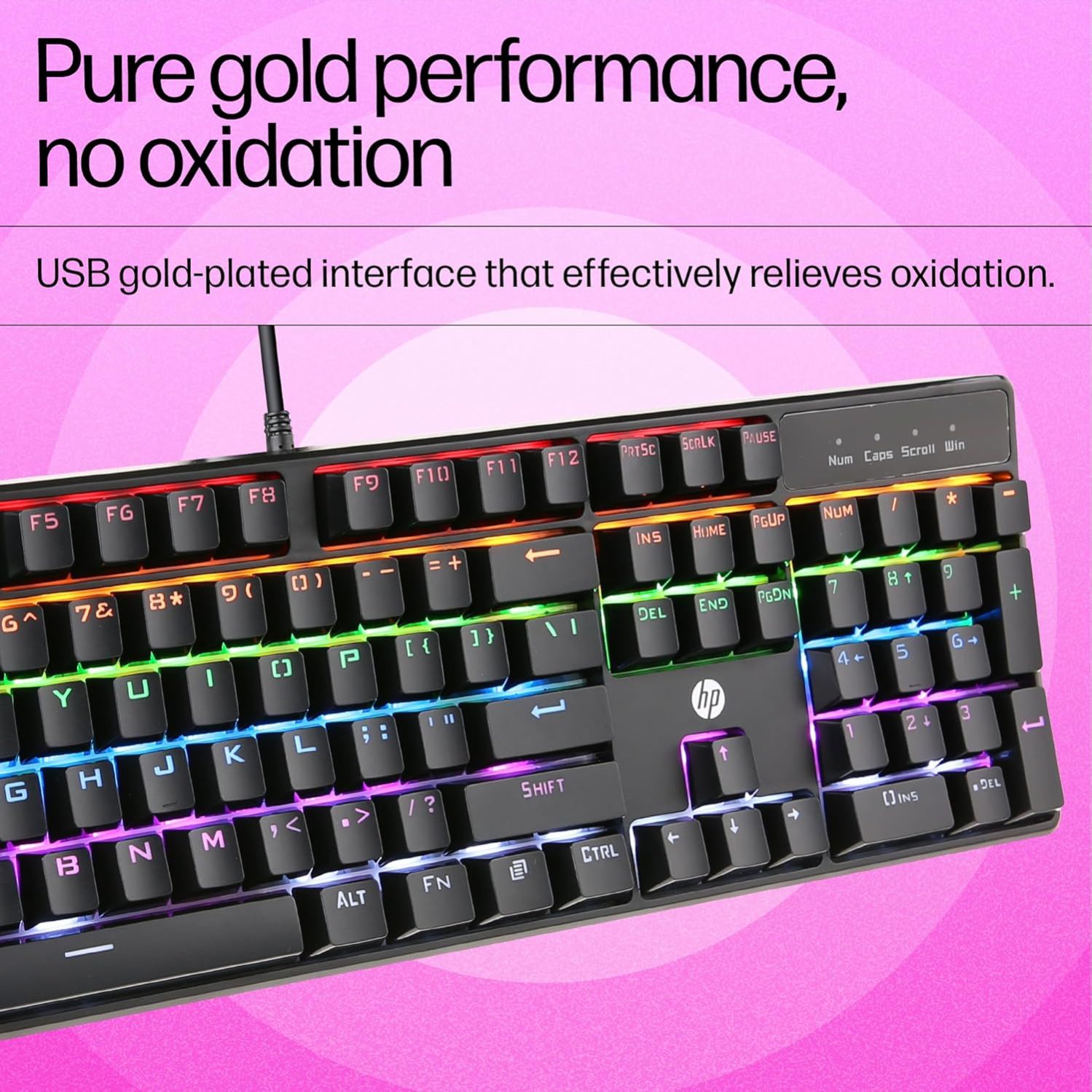 HP GK320 Wired Full Size RGB Backlight Mechanical Gaming Keyboard, 4 LED Indicators, Mechanical Switches, Double Injection Key Caps, and Windows Lock Key