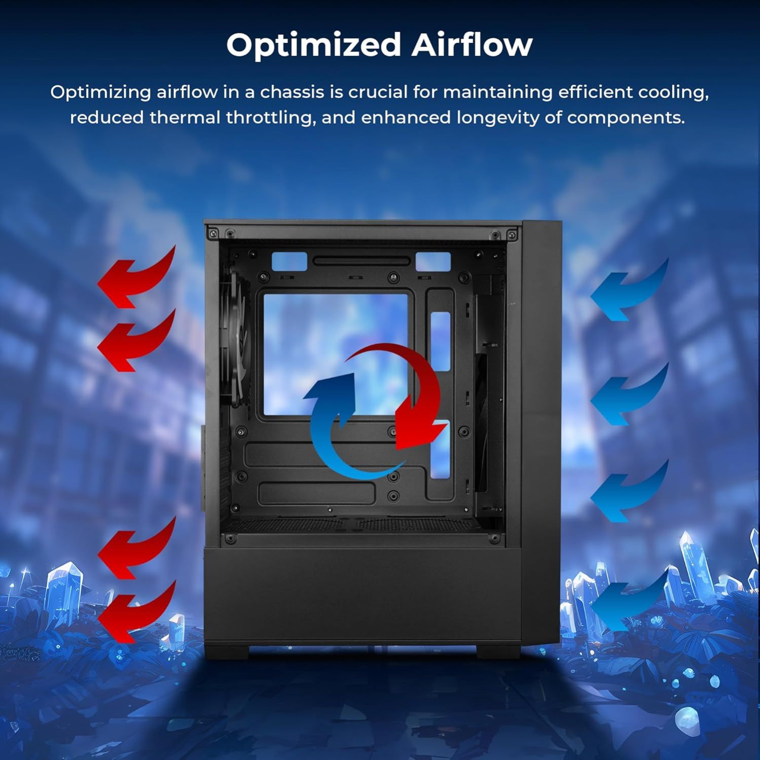 - Perforated design: This compact chassis has a tempered glass side panel with a perforated mesh front for airflow.