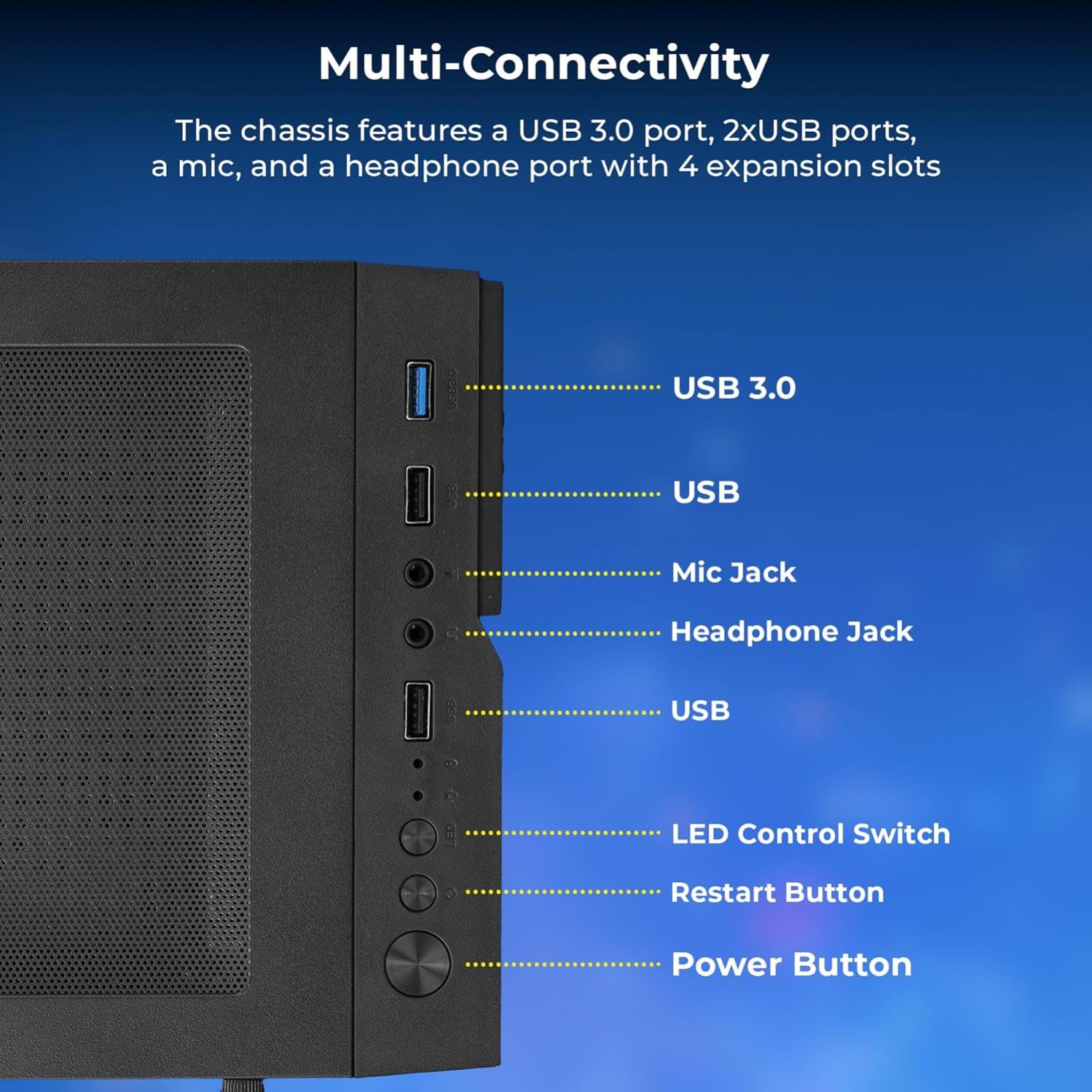- Multi-connectivity: The chassis has a USB 3.0 port, 2 USB ports, a mic, and a headphone port with 4 expansion slots.