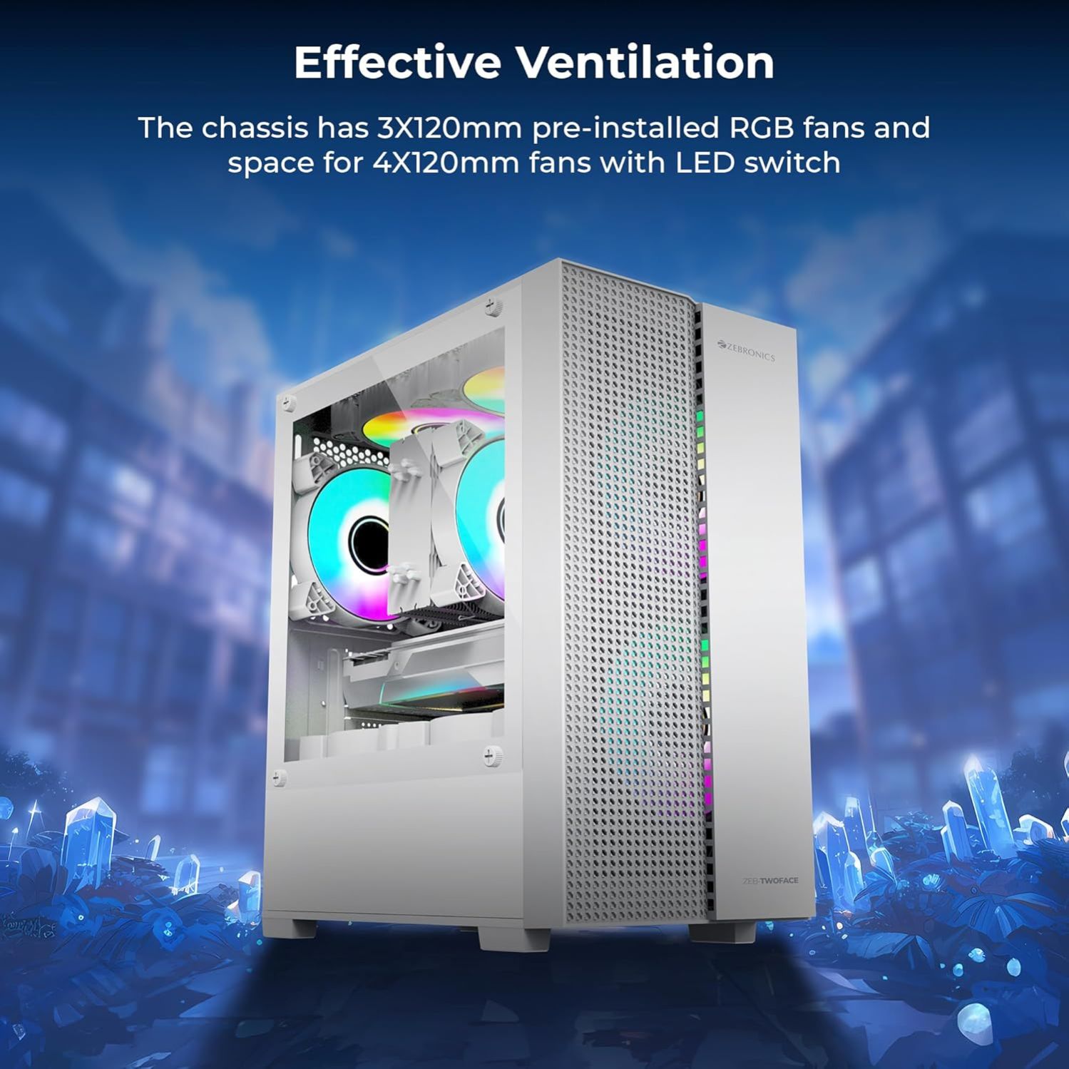 ZEBRONICS TWOFACE Premium Gaming Cabinet/Case, Mini-Tower, Supports mATX | ITX, 3 Built-in Inner Glow RGB Fans, LED Control Switch, Tempered Glass, USB 3.0, Magnetic Dust Filter (White)
