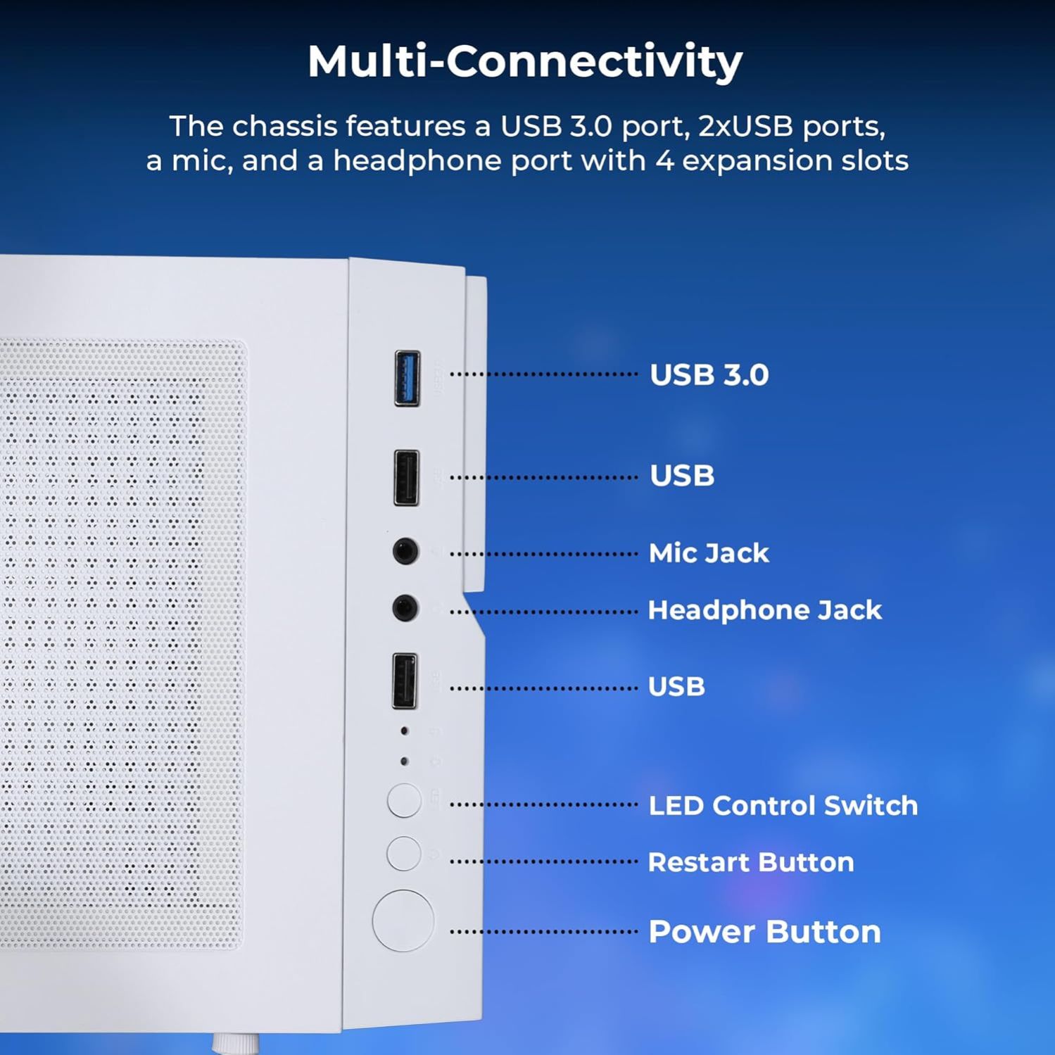 - Multi-connectivity: The chassis has a USB 3.0 port, 2 USB ports, a mic, and a headphone port with 4 expansion slots.